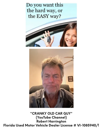 SIMPLY ANSWER THE 5 BASIC GENERAL QUESTIONS IN THE Q&A BELOW: *YOUR INFORMATION IS PRIVATE AND CONFIDENTIAL.* YOUR ANSWERS OR PERSONAL INFORMATION WILL NOT BE SOLD OR TRANSFERED TO ANY THIRD PARTIES (OTHER THAN THE PRIVATE PARTY LAWFUL OWNER/SELLER AND ROB HARRINGTON.) (HE IS A LICENSED, BONDED & INSURED USED MOTOR VEHICLE DEALER & BUSINESS LEGALLY REGISTERED AND COMPLIANT WITH ALL FEDERAL & FLORIDA STATE LAWS, STATUTES & CODES AS ENFORCED BY THE FLORIDA DEPARTMENT OF HIGHWAY SAFETY AND MOTOR VEHICLES (FLHSMV) AND ALL APPLICABLE ADDITIONAL RELATED FEDERAL & FLORIDA STATE AGENCIES.) [*NOTE: ALL FLORIDA USED MOTOR VEHICLE DEALERS ARE REQUIRED TO PASS ALL MANDATED REGULAR CRIMINAL BACKGROUND INVESTIGATIONS, STATE SANCTIONED TRAINING & CONTINUING EDUCATION, & BOND REQUIREMENTS.] (FL LICENSE # VI-1085940/1)